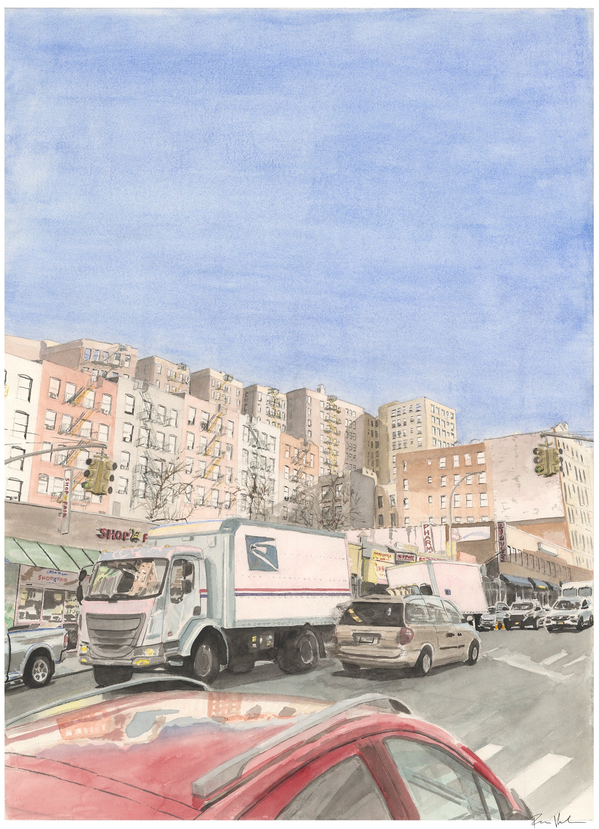 This is a well-worn stretch of Broadway at 192nd Street in Washington Heights. It was its usual bustling self when I walked by and was enthralled by the darker foreground against a bright background of diagonals beneath a clear blue sky.