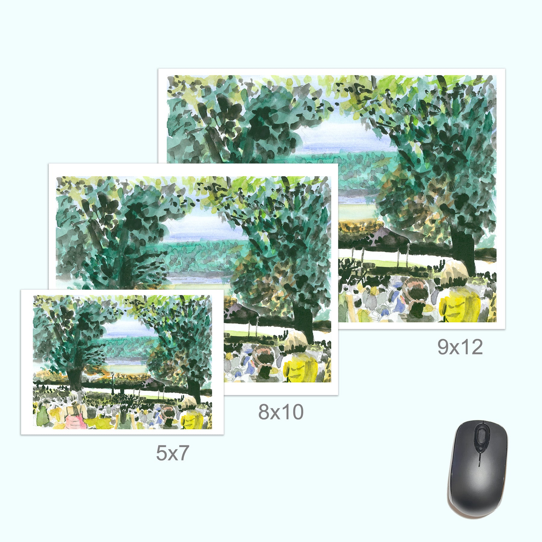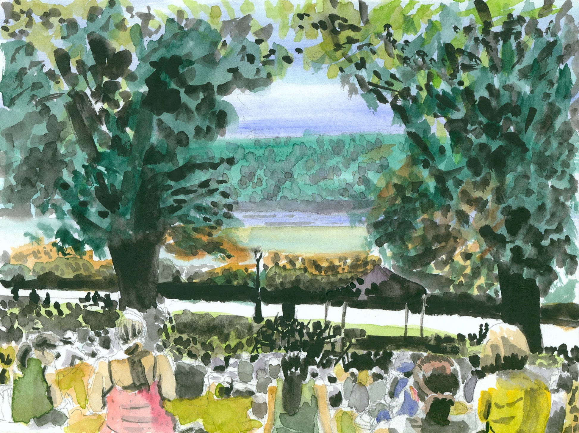 Crowd on Billings Lawn, Watercolor, Plein Air, Hudson River Scene