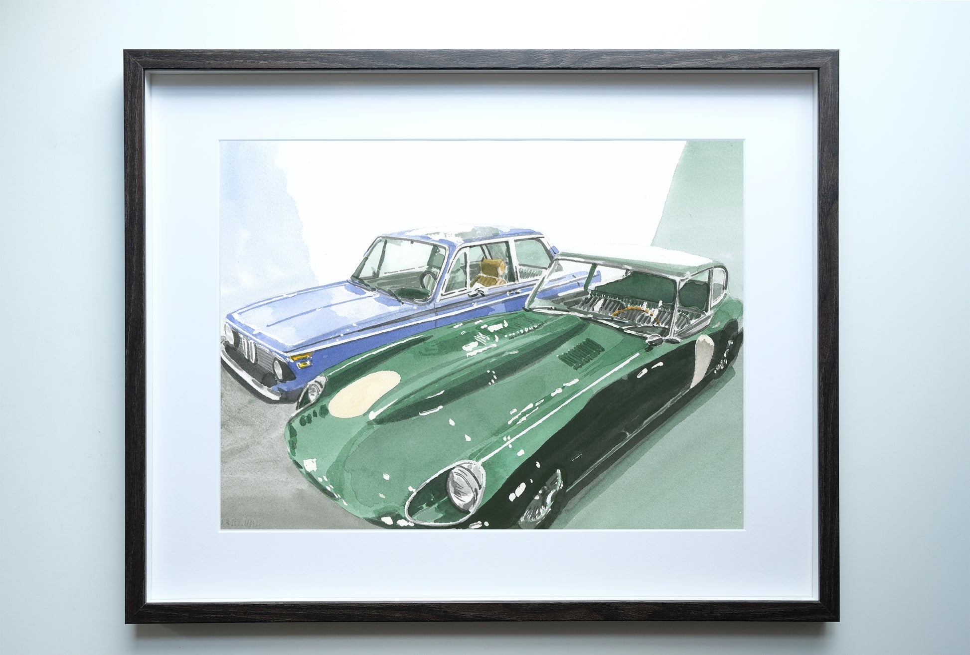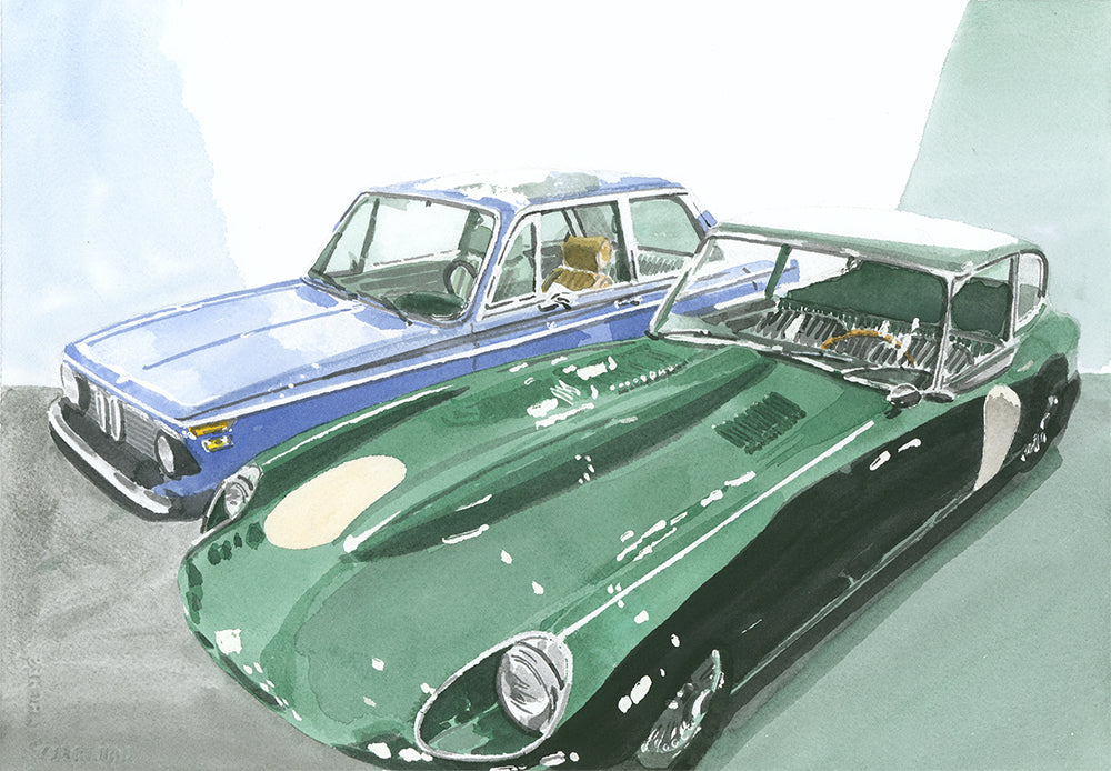 Jaguar E-Type and BMW 2002 Painting, Classic Cars, Watercolor, Print