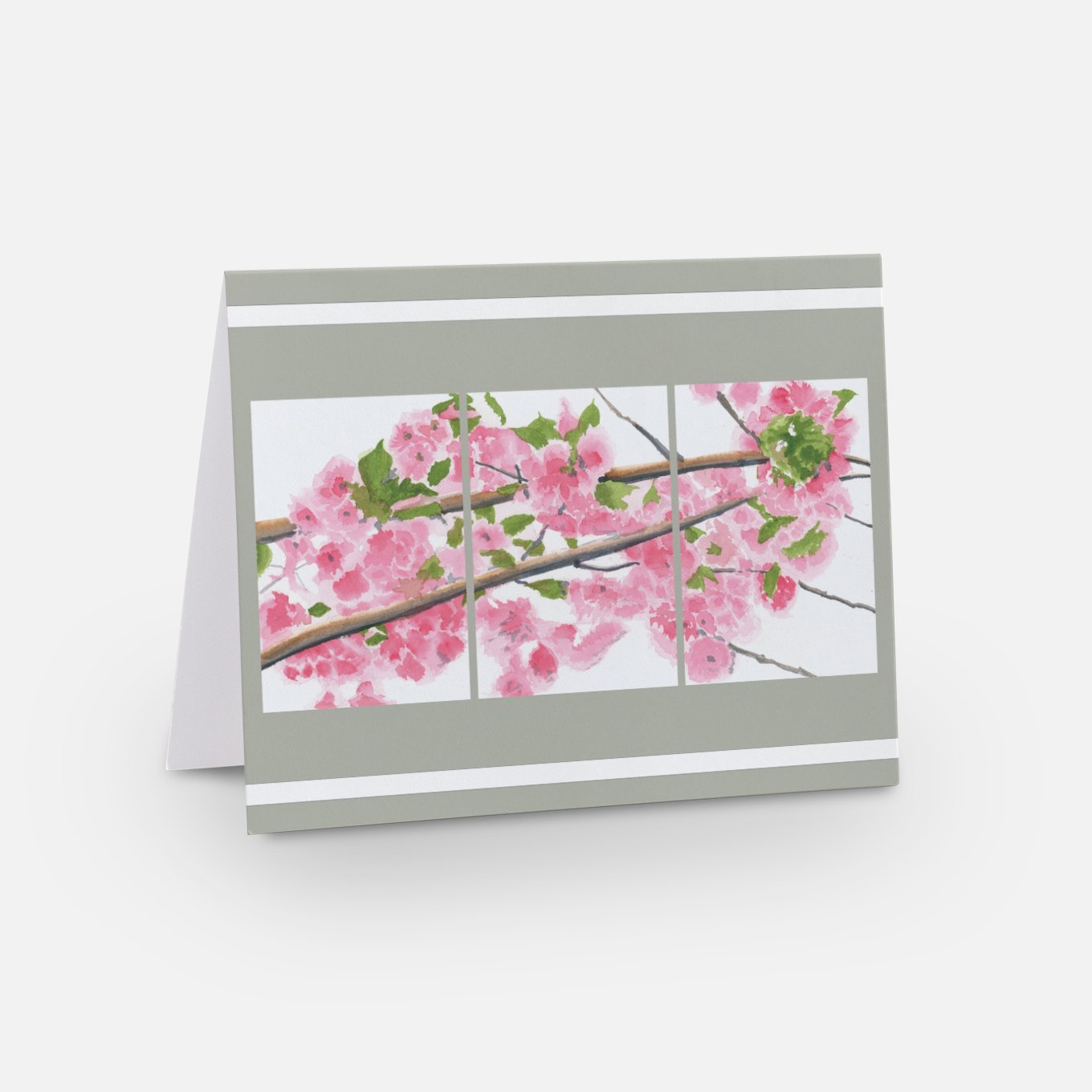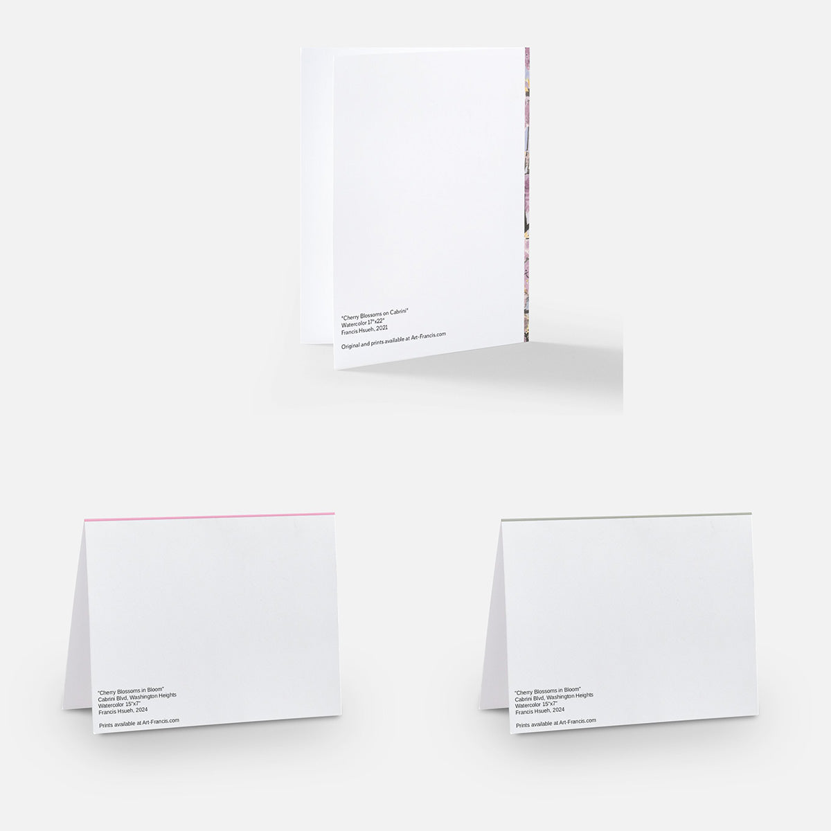 The Cherry Blossoms Series features 9 notecards and 3 designs. These cards are printed on an Italian cotton paper, with a lightly woven texture. They are blank on the inside, and come with smooth white envelopes.